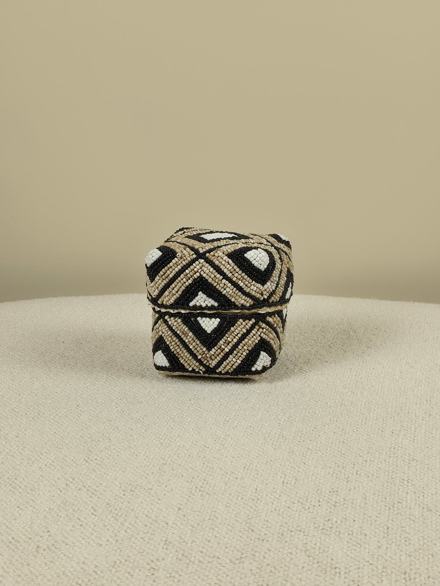 De Eloise is het offermandje dat alle basiskleuren samenbrengt. Wit, beige en zwart — licht, warmte en kracht in één compact kralenmandje. Het is de meest veelzijdige kleurcombinatie van de serie: de Eloise sluit aan bij lichte én donkere stylings, bij warme én strakke interieurs. Eén mandje, elke context.