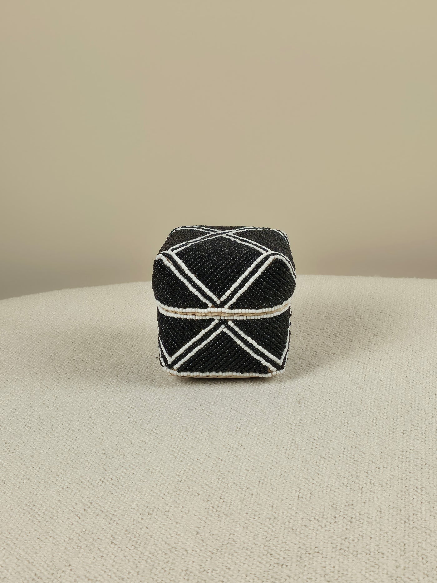 De Xav is het offermandje dat alles terugbrengt tot de essentie. Zwart en wit — de twee uitersten, zonder tussentoon. Geen beige, geen bruin, maar puur contrast in Balinees kralenwerk. Het is het meest uitgesproken offermandje van de serie.