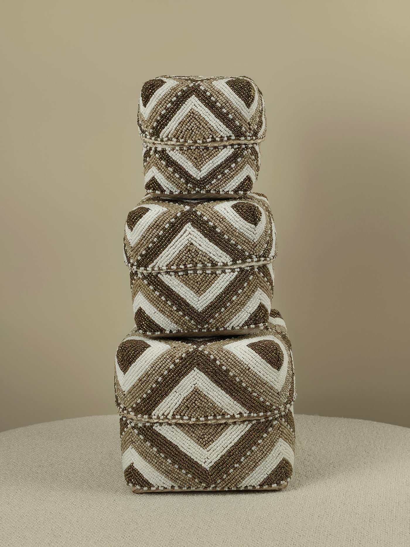 De Axelle is het offermandje dat het meeste kleur durft. goud, beige en wit — drie tinten die samen een warm, gelaagd geheel vormen dat rijker en dieper is dan elke tweekleurige variant. Van donker naar licht, van aarde naar lucht, drie kleuren die in kralenwerk een verloop creëren dat je van dichtbij steeds meer laat zien. Bestaande uit S, M en L met deksel.