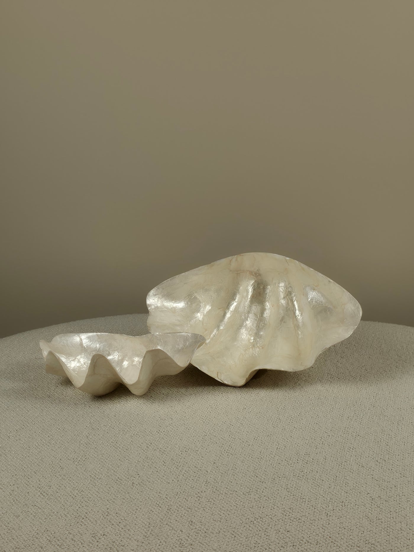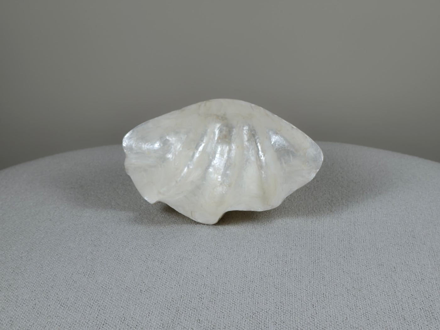 Een schaal van schelpen, in de vorm van een schelp — parelmoer dat zichzelf citeert. Iriserende glans in een silhouet dat direct doet denken aan de oceaan, waar het ook vandaan komt.