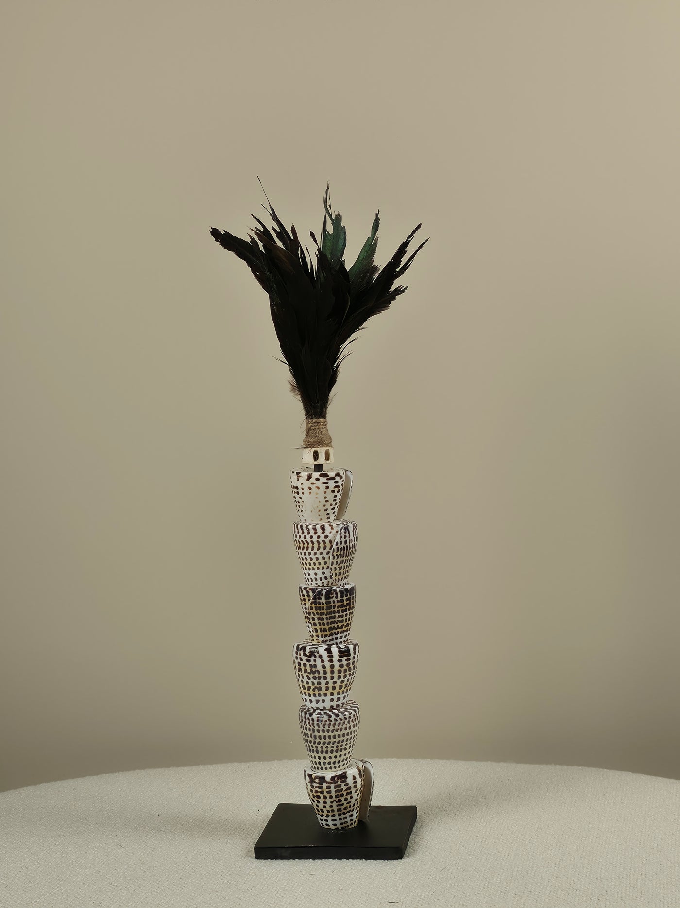 De Quinn is het stuk dat omhoog reikt. Een toren van schelpen, veren en hout in wit en zwart — verticaal, dramatisch en met een verentooi die het object een bijna koninklijke uitstraling geeft. Geen breed ornament, geen platte schaal, maar een toren die de hoogte in gaat en elke ruimte een verticaal ankerpunt biedt. Beschikbaar in 30, 40 en 50cm.