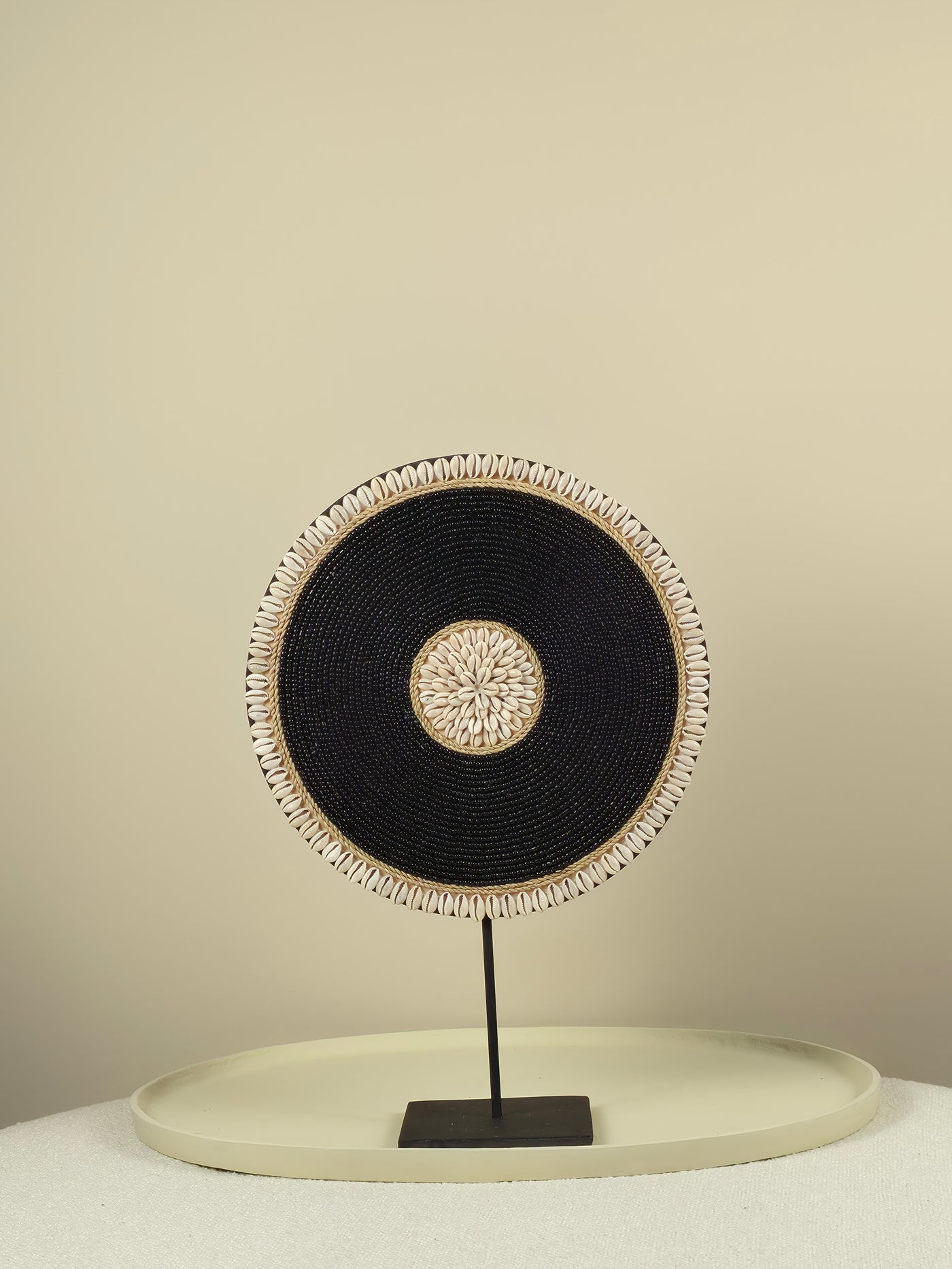 De Elody is een decoratief ornament opgebouwd uit hout, kralen, raffia en schelpen, gepresenteerd op een zwarte ijzeren standaard. De materialen in het zwart creëren een ander effect dan de materialen in het wit: het zwart absorbeert licht en dwingt je om textuur anders waar te nemen. De kralen zijn donker en structureel, de schelpen onthullen hun glans alleen wanneer het licht ze precies raakt. Van een afstandje is de Elody een imposant, donker silhouet. Van dichtbij ontvouwt zich een textuurlandschap dat je ontdekt in schaduwen in plaats van in licht.