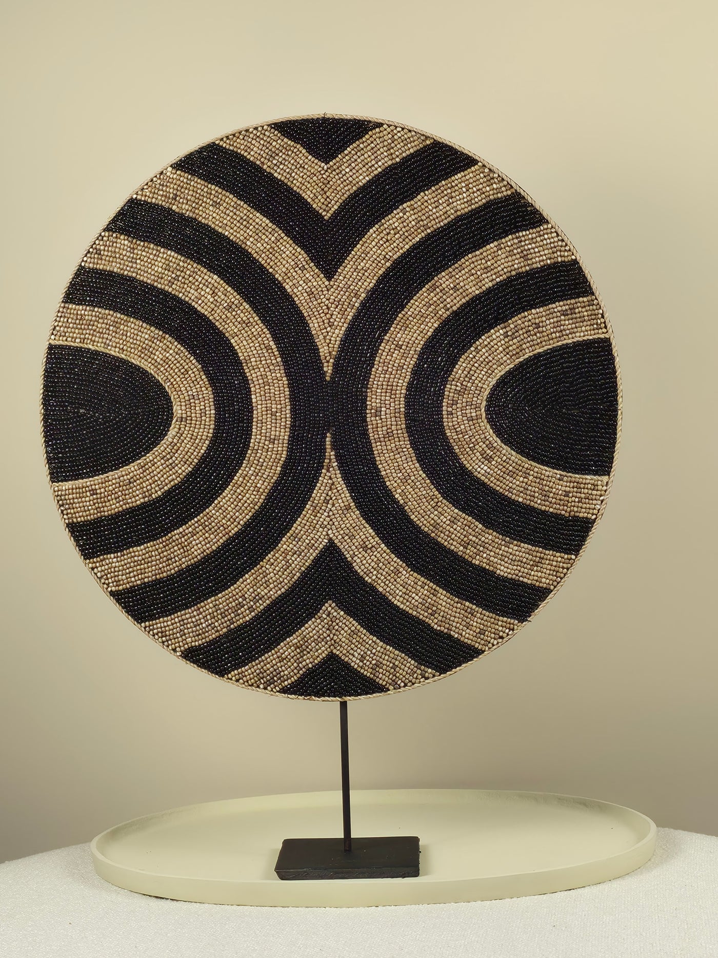 De Max is een decoratief ornament opgebouwd uit hout en kralen in beige en zwart, gepresenteerd op een zwarte ijzeren standaard. Het zwart verandert de dynamiek compleet: waar de Lucy in wit en beige een rustgevende zachtheid uitstraalt, brengt de Max spanning en contrast. De beige kralen houden de warmte vast, de zwarte kralen voegen diepte en kracht toe. Samen creëren ze een ornament dat stoerder en uitgesproken is.