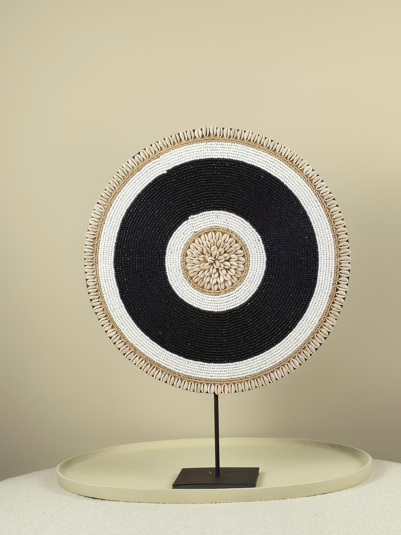 De Rebel is een decoratief ornament opgebouwd uit hout, kralen, raffia en schelpen in zwart en wit, gepresenteerd op een zwarte ijzeren standaard. De combinatie van vier materialen mét kleurcontrast levert het meest complexe ornament van de collectie op.