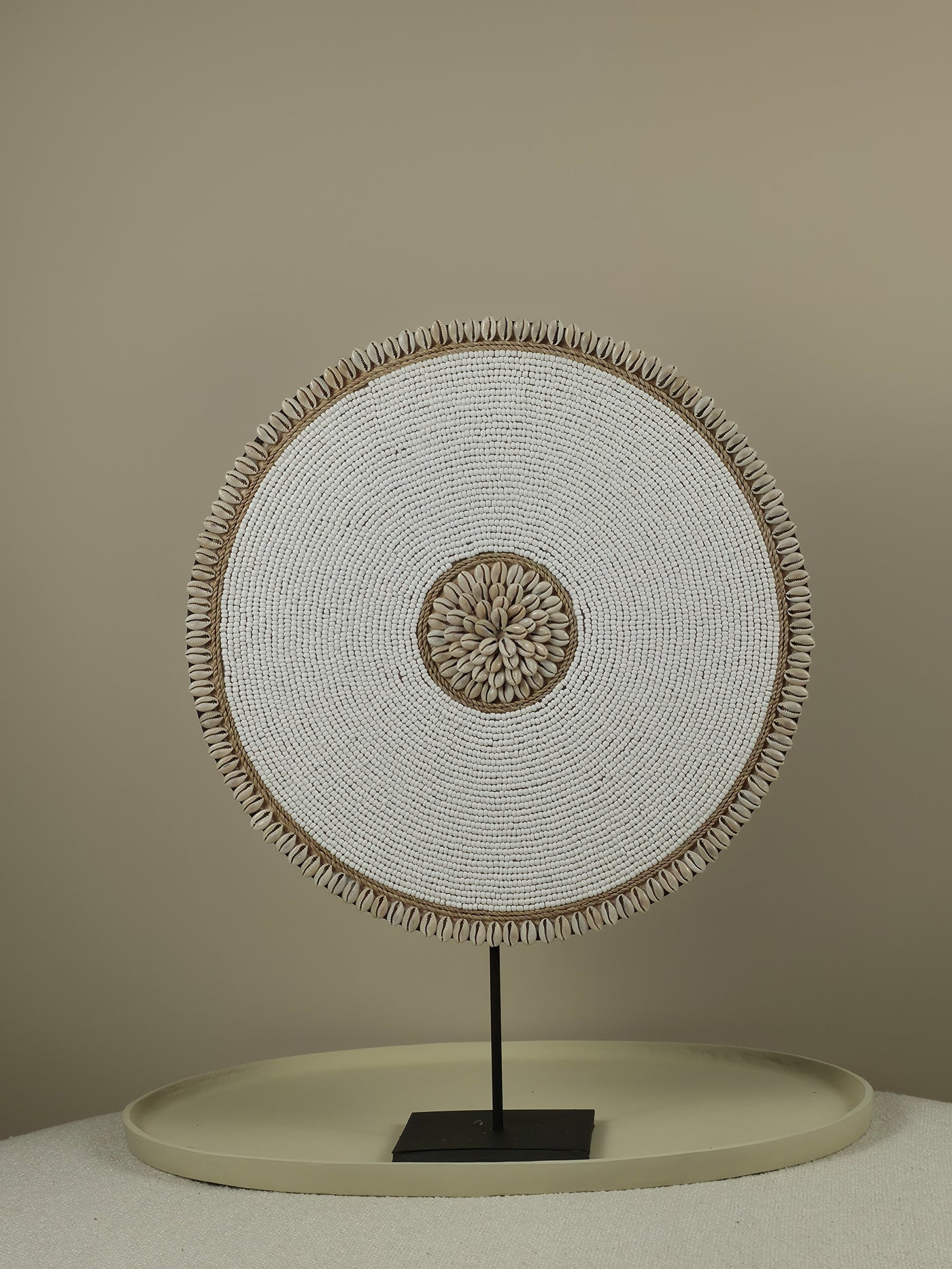De Snowy is een decoratief ornament opgebouwd uit kralen, raffia en schelpen in wit, gepresenteerd op een zwarte ijzeren standaard. Drie materialen in één kleur is zeldzaam in de collectie — en het effect is bijzonder. Elke textuur brengt z'n eigen nuance: de kralen zijn mat en structureel, de schelpen zijn glad en glanzend, de raffia zacht. In wit smelten ze samen tot één geheel dat je van een afstandje als puur wit ervaart en van dichtbij als een landschap van texturen ontdekt.