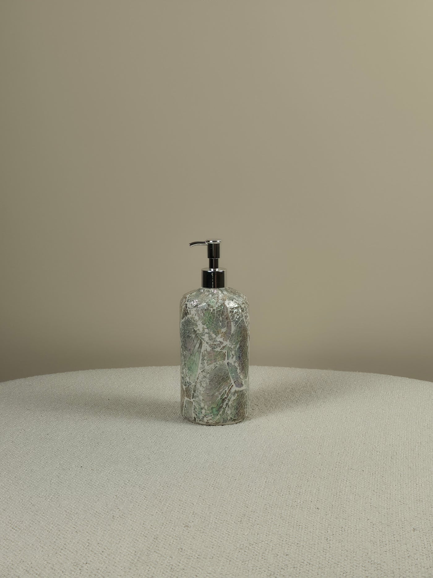 De Miles is een zeepdispenser in warme tinten, met parelmoer patroon erop. Het parelmoer van de schelpen vangt het licht met die kenmerkende iriserende glans — zilverig, roze, zacht groen — afhankelijk van hoe het licht erop valt. Samen vormen ze een zeepdispenser die je niet wegstopt achter de kraan maar trots vooraan op je wastafel zet — een dagelijks gebruiksvoorwerp dat voelt als een sieraad.