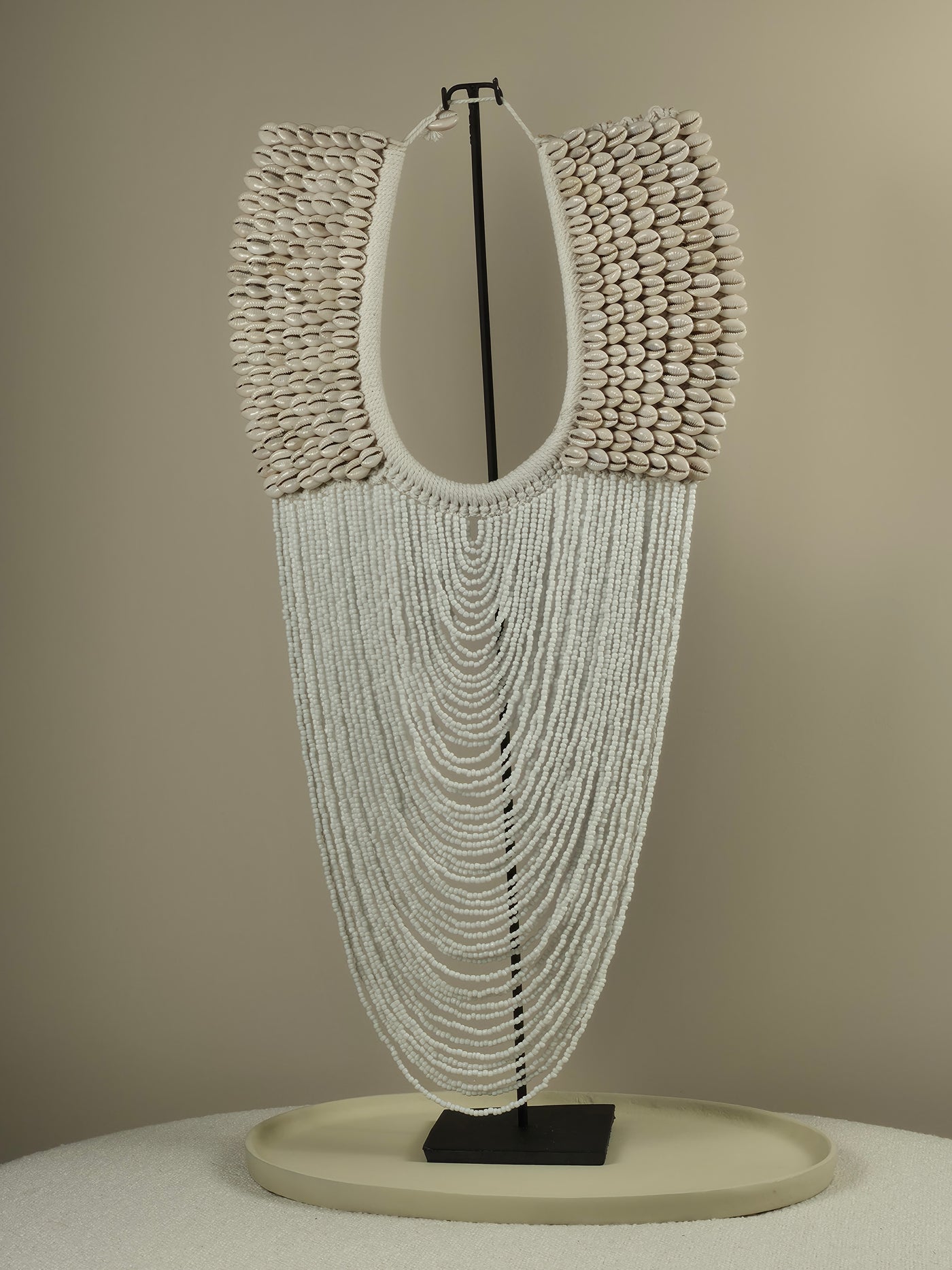 De Liam is een decoratieve ketting opgebouwd uit schelpen, kralen en touw in wit, gepresenteerd op een zwarte ijzeren standaard. De ketting drapeert sierlijk over de standaard in een vloeiende lijn van witte schelpen en kralen die met touw aan elkaar zijn verbonden. Het wit geeft de ketting een frisse, serene uitstraling, terwijl de zwarte standaard voor een elegant contrast zorgt. De schelpen voegen zachte glans toe tussen de matte kralen, het touw brengt organische verbinding. Twee formaten — Small en Large — voor elk oppervlak en elke ambitie.